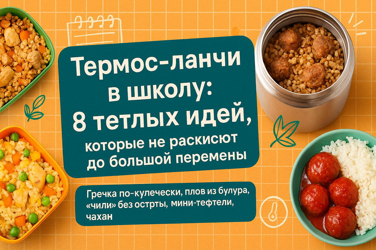 Привет! Я — та самая мама, что ставит на плиту односковородные блюда и проверяет их… термосом. В этой подборке — 8 живых карточек без таблиц, только рабочие рецепты, которые не «раскисают», держат форму и вкус до большой перемены. В каждой карточке — граммы, диаметр посуды, время, детские замены специй и лайфхаки упаковки. Берём термос с широким горлом (0,5–0,75 л), прогреваем его кипятком 5 минут — и завтрак превращается в тёплый обед. Поехали! 🙌
