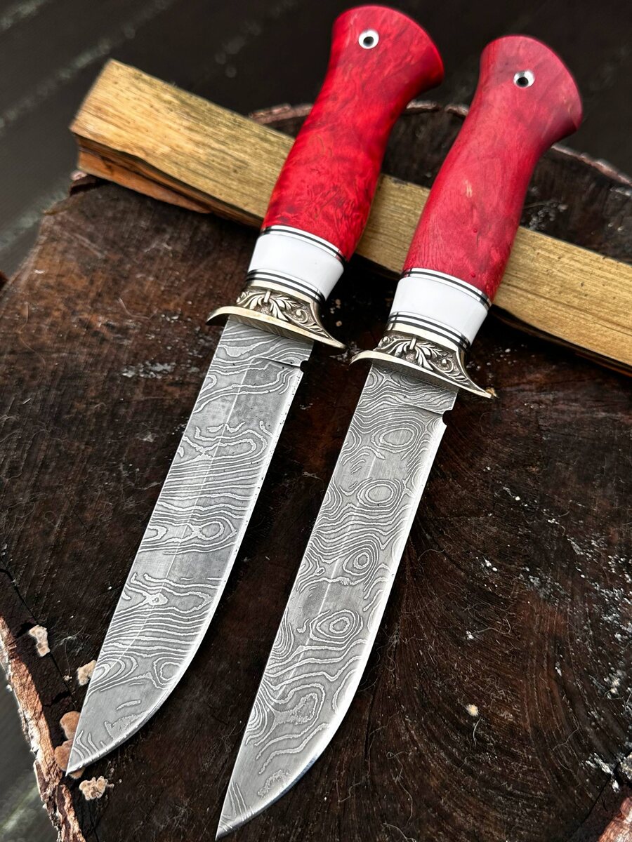 Клинок из волнистого дамаска(HRC 62) — гарантирует долгую остроту, агрессивный рез и настоящую рабочую мощь. Бритвенная заточка и чуть вогнутая линза от середины спусков позволяют легко справляться с любыми разделочными задачами: мясо, рыба, дичь — всё под контролем!