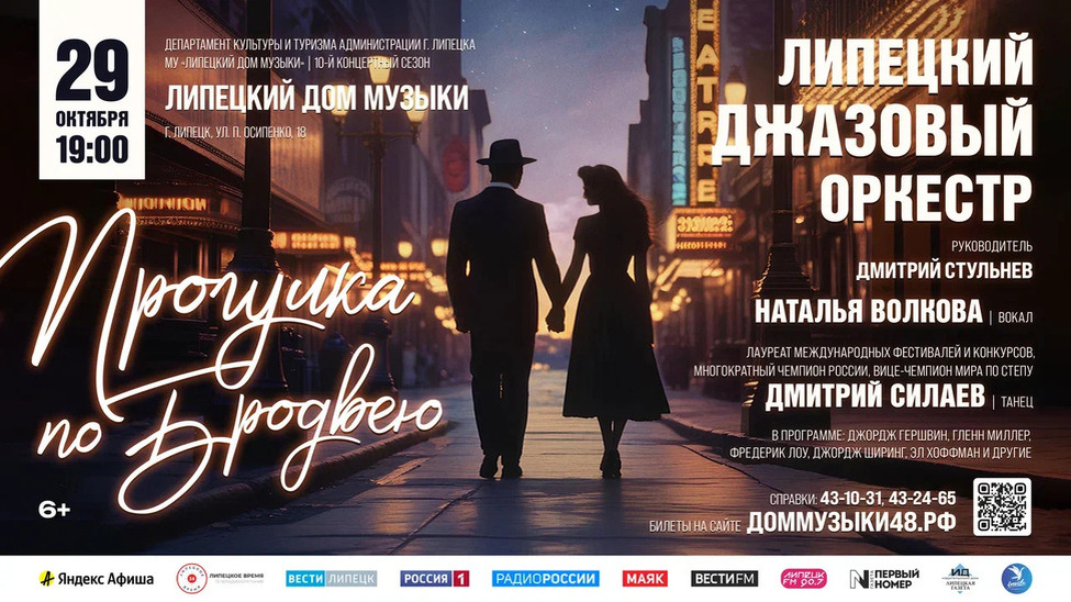 В Липецком Доме музыки для жителей областного центра подготовили джазовый концерт «Прогулка по Бродвею» (6+). Любители джаза услышат вокальные и инструментальные произведения, в том числе из популярных мюзиклов и фильмов «Мы из джаза», В джазе только девушки".