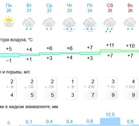 Со вторника на пятницу в светлое время суток ожидается 4-7 градусов тепла. Ночью — до четырех градусов со знаком «плюс». Осадки будут минимальными.