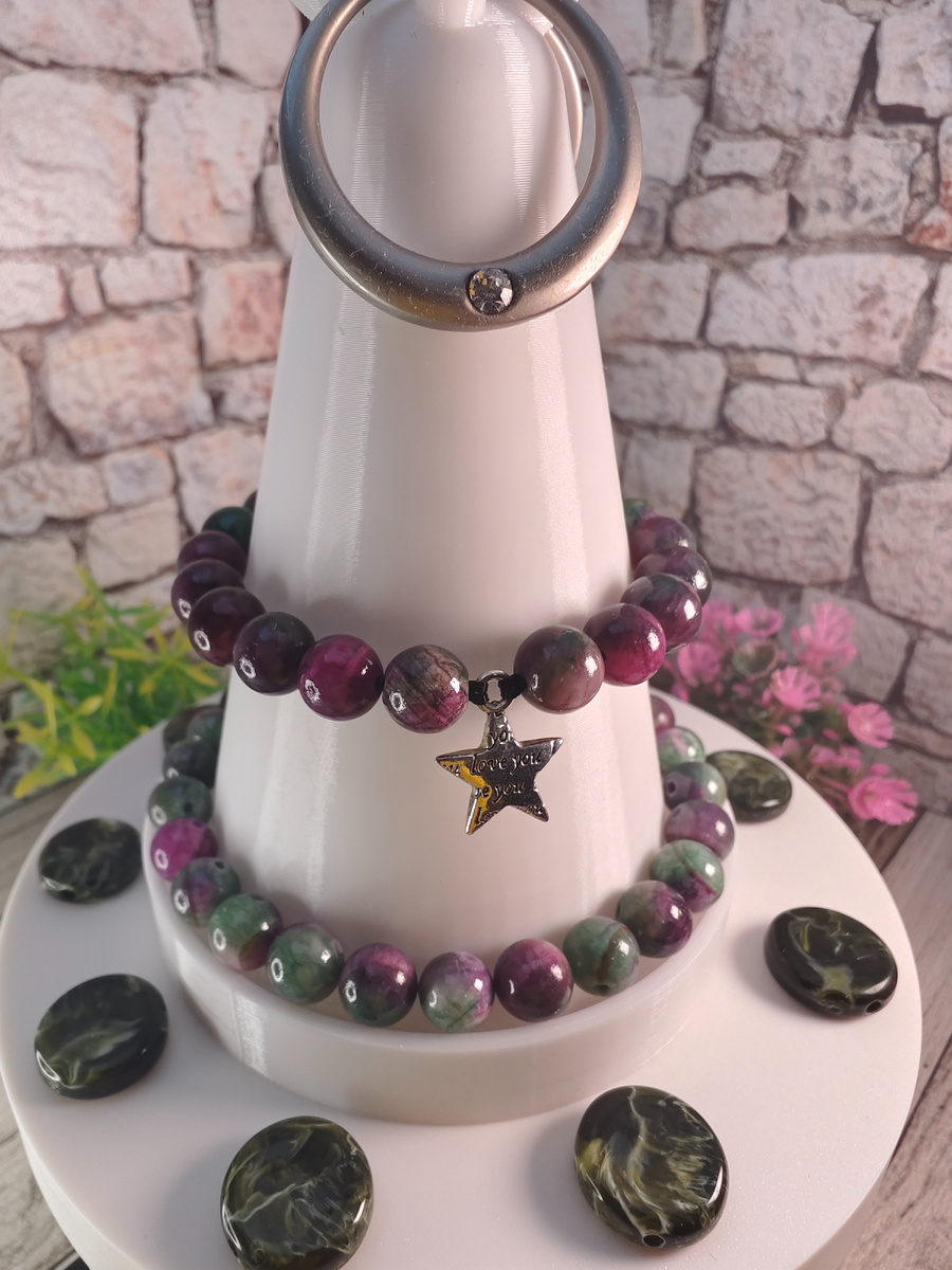 Браслет сделан из бусин и подвески на эластичной резинке Бусины очень красивые в зеленых и розовых тонах. Порой встречаются светлые жилки, но я их избегала в подборке бусин для браслета и брала бусины потемней Подвеска из металла с надписями "Love you". Закрепила резинку прямо к ней ради эксперимента. Резинка получилась в две жилы и это очень упрочнила конструкцию, а так же растяжение стало более плотным. Посмотреть прокрутку на стенде можно в ролике