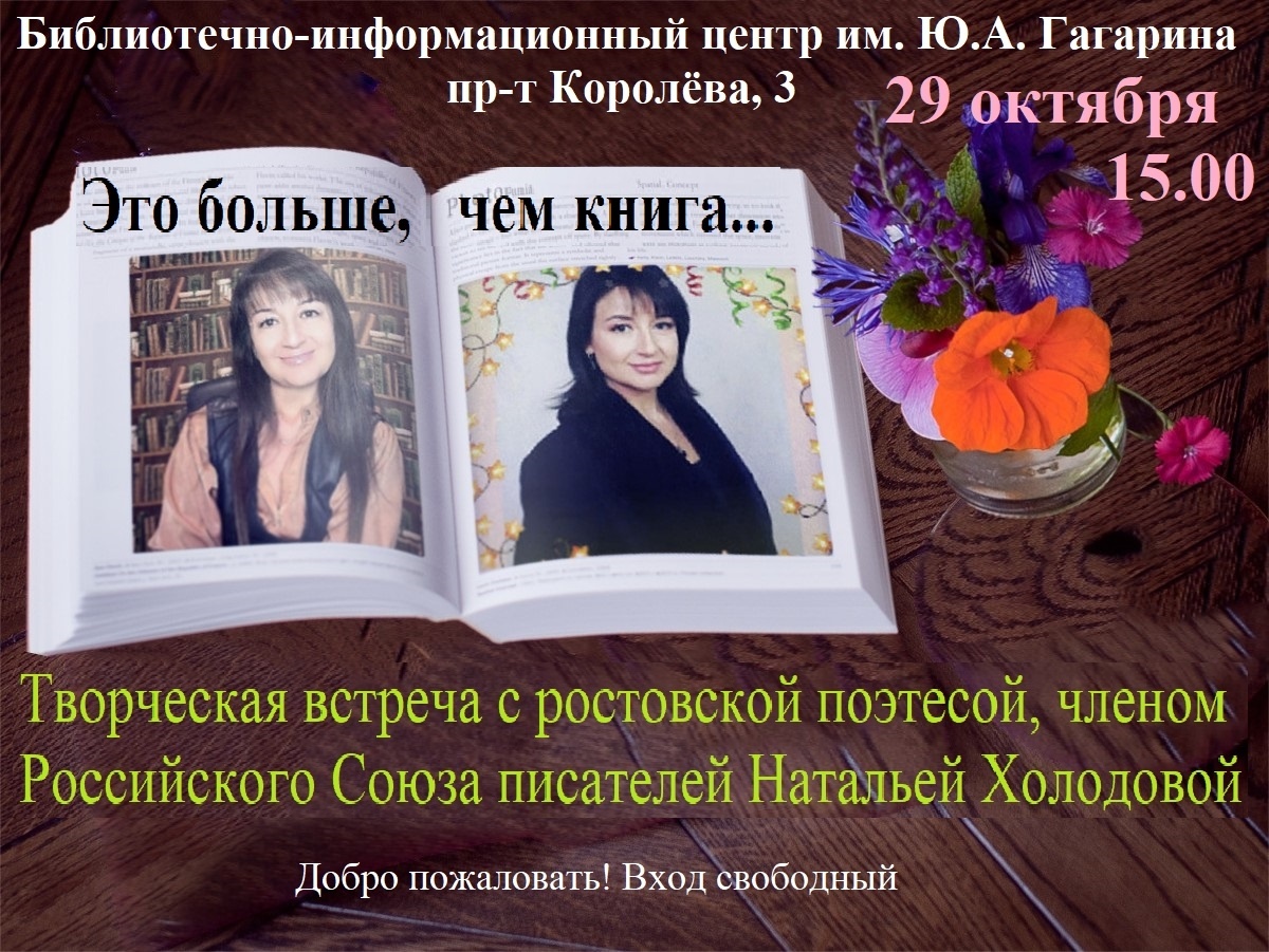 Яркое событие в Ростове-на-Дону: творческий вечер поэтессы Натальи Холодовой 29 октября в 15:00 в Библиотечно-информационном центре им. Ю. А. Гагарина (г. Ростов-на-Дону, проспект Королёва, 3) состоится творческий вечер поэтессы, психолога и автора книг Натальи Холодовой. 📖 Повод для встречи — выход первой поэтической книги автора «Люблю… Девчонка на песке писала». «Это — больше, чем книга. Это — я без прикрас,