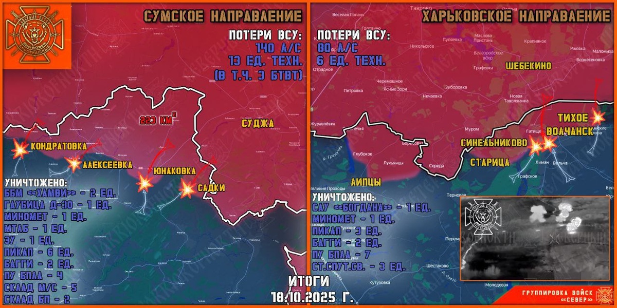 На курско-сумском направлении летчики РФ разгромили ВСУ у Рыжевки По информации сводки на утро 19 октября военкоров телеграм-канала «Северный Ветер», на курско-сумском направлении штурмовики РФ движутся вглубь Сумщины. Противник вчера предпочел удерживать позиции, укрепляя оборону. На Теткинском и Глушковском участках фронта продолжает работать авиация и артиллерия РФ по скоплениям ВСУ. Так, пилоты РФ работали по позициям ВСУ в районе Рыжевки. Тем временем, штурмовые группы морпехов продвинулись по лесополосам на правом фланге наступления. Общее продвижение составило до 100 метров. За сутки ВСУ потеряли свыше 220 человек. При этом, более 140 ВСУшников убито в Сумской области и свыше 80 - в Харьковской.