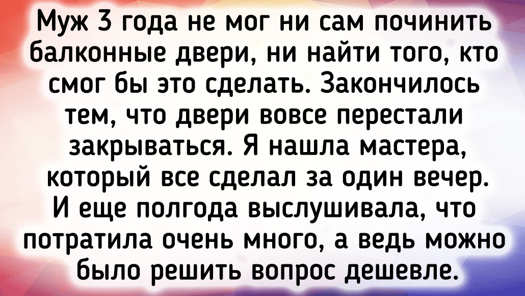 Муж 3 года не мог ни сам починить балконные двери, ни найти того, кто смог бы это сделать. Закончилось тем, что двери вовсе перестали закрываться. Я нашла мастера, который все сделал за один вечер. И еще полгода выслушивала, что потратила очень много, а ведь можно было решить вопрос дешевле. © Оксана Буцулина / Dzen