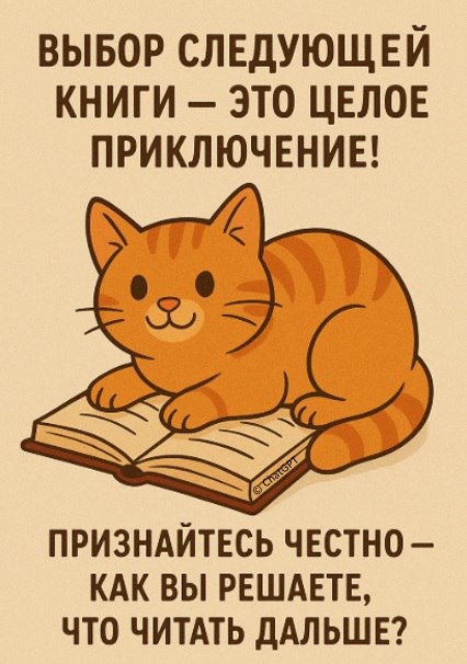 Выходной! Время поразвлечься.😉 Выбор следующей книги — это целое приключение! Кто-то устраивает сложные стратегии отбора, кто-то сверяется со знаком судьбы… а кто-то просто даёт книге упасть на голову и читает её. Признайтесь честно, как вы решаете, что читать дальше? #опрос