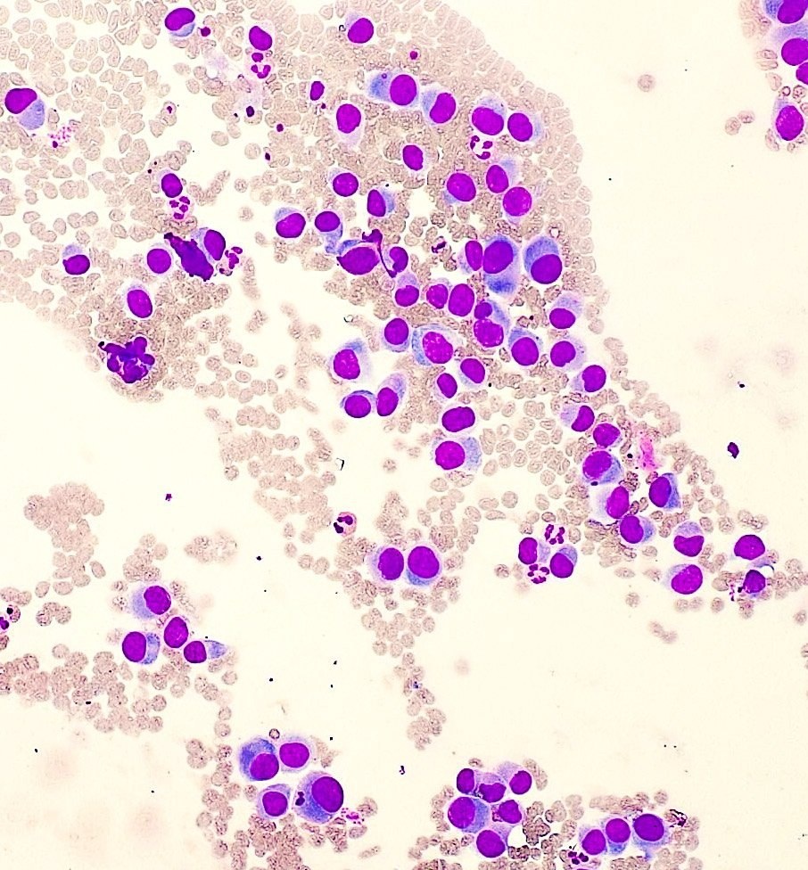 Материал ТАБ околоушной слюнной железы с признаками метастаза меланомы Как в учебнике: диссоциированные клетки с эксцентрически расположенными ядрами #слюннаяжелеза #цитология