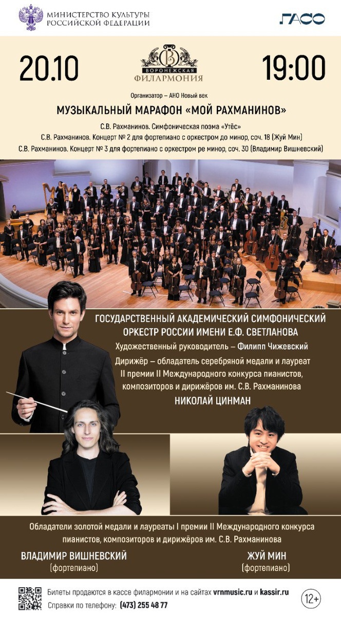 20 октября Воронежская филармония станет площадкой для выступления одного из ведущих симфонических коллективов страны – Государственного академического симфонического оркестра России имени Е.Ф. Светланова. Концерт пройдет в рамках всероссийского музыкального марафона «Мой Рахманинов», организованного при поддержке Министерства культуры РФ.