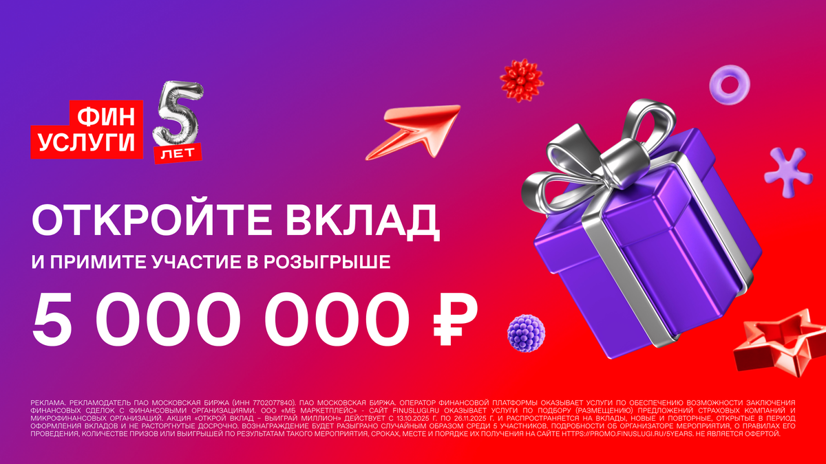 2️⃣ Выберете вклад от 10 000р, срок вклада от 1 мес и нажмите «Открыть онлайн» 3️⃣ Зарегистрируйтесь на Финуслугах или авторизуйтесь 4️⃣ Отправьте заявку на вклад. Пополните вклад через личный кабинет на Финуслугах Участие в акции активируется автоматически!👌🏻 ❗️Акция доступна для всех пользователей. Всего разыгрывается 5 000 000 рублей, будет выбрано 5 победителей, которые получат по 1 000 000 рублей. ✨Срок открытия вкладов с 13 октября по 12 ноября. Финуслуги - это: ✔️Единый доступ к финансовым услугам ведущих российских банков и страховщиков ✔️Надежность и прозрачность (входит в группу Московской биржи) ✔️Онлайн-оформление без посещения офисов Срок проведения акции 15.10.2025 — 12.11.2025