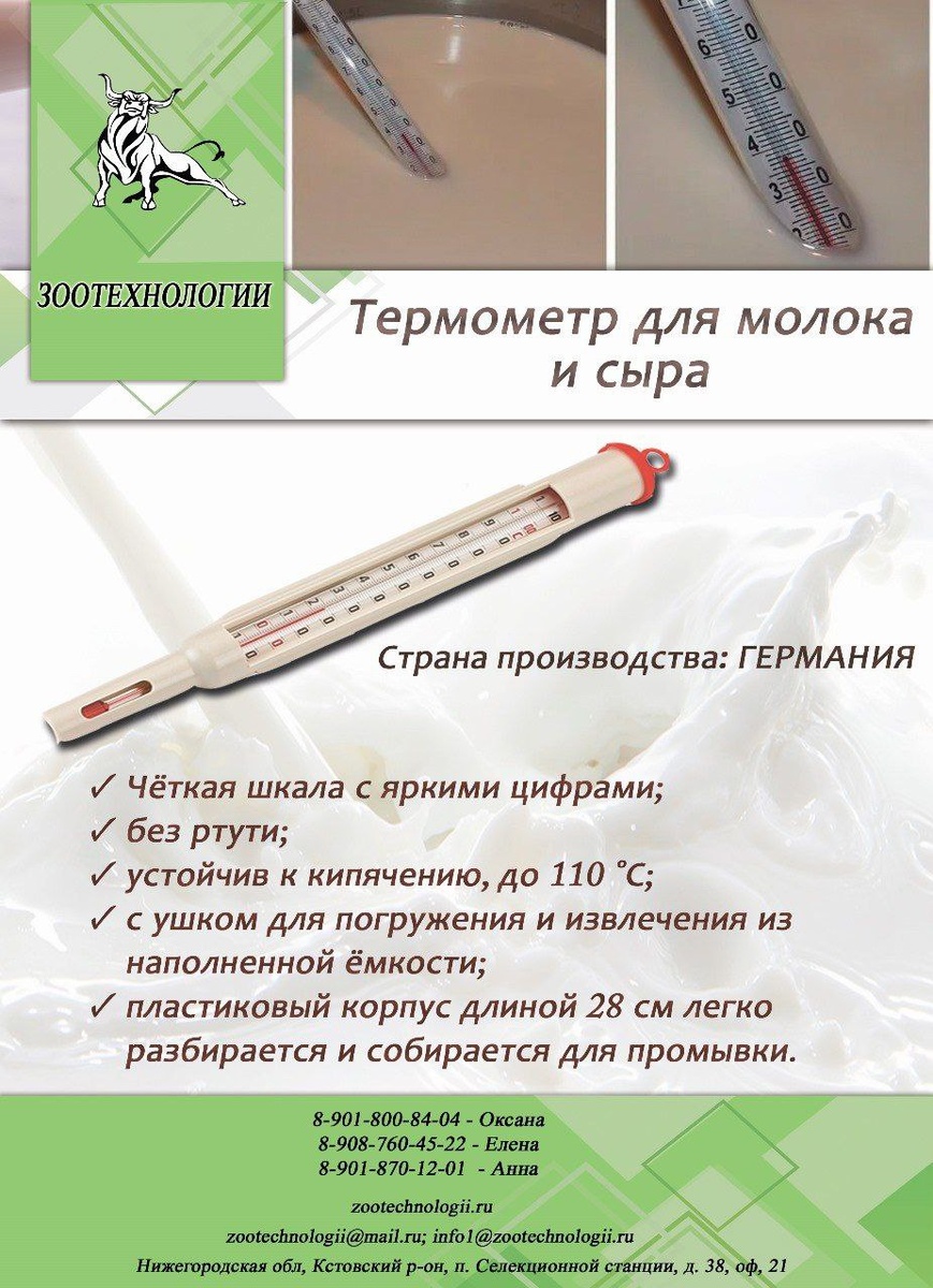 В продаже термометр для молока и сыра Kerbl, который предназначен для точного определения температуры при переработке молока и сыроварении