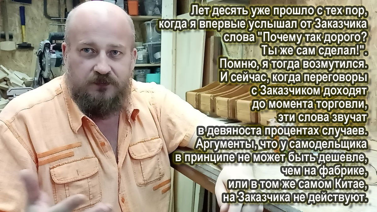 Прошло уже лет десять, как я впервые услышал от заказчика эти, казалось бы, невинные слова: "Почему так дорого? Ты же сам сделал!". Тогда я был возмущен. Сегодня, когда переговоры с клиентами подходят к этапу торга, эта фраза звучит в девяноста процентах случаев. И, что самое удивительное, никакие аргументы о том, что работа мастера-одиночки не может стоить дешевле фабричного производства или товаров из Китая, на заказчика не действуют.
