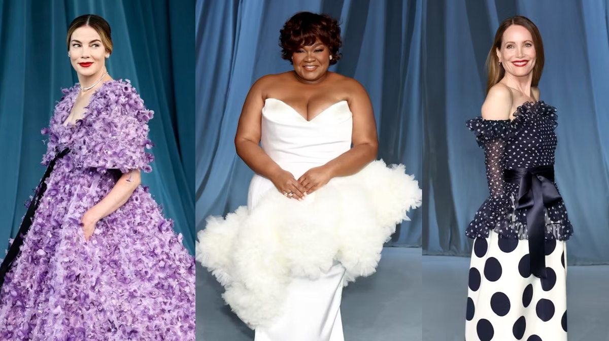 Мишель Монахан выбрала платье Carolina Herrera из коллекции весна-лето 2026 - объёмное, покрытое фиолетовыми трёхмерными цветами и перевязанное чёрной лентой. Вместо изысканности и романтичности получилось ощущение декоративного переизбытка: платье утяжеляет фигуру и лишает актрису пропорций. В этом образе Монахан словно растворилась в ткани - слишком много деталей, слишком мало самой звезды.