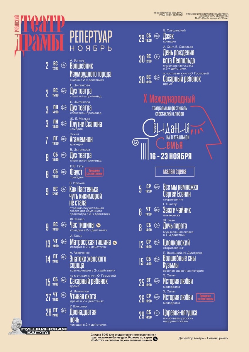 ✍️ Рязанский театр драмы поделился афишей на ноябрь, напомнил о «Свиданиях на Театральной» и запустил продажу билетов на новогодний променад.