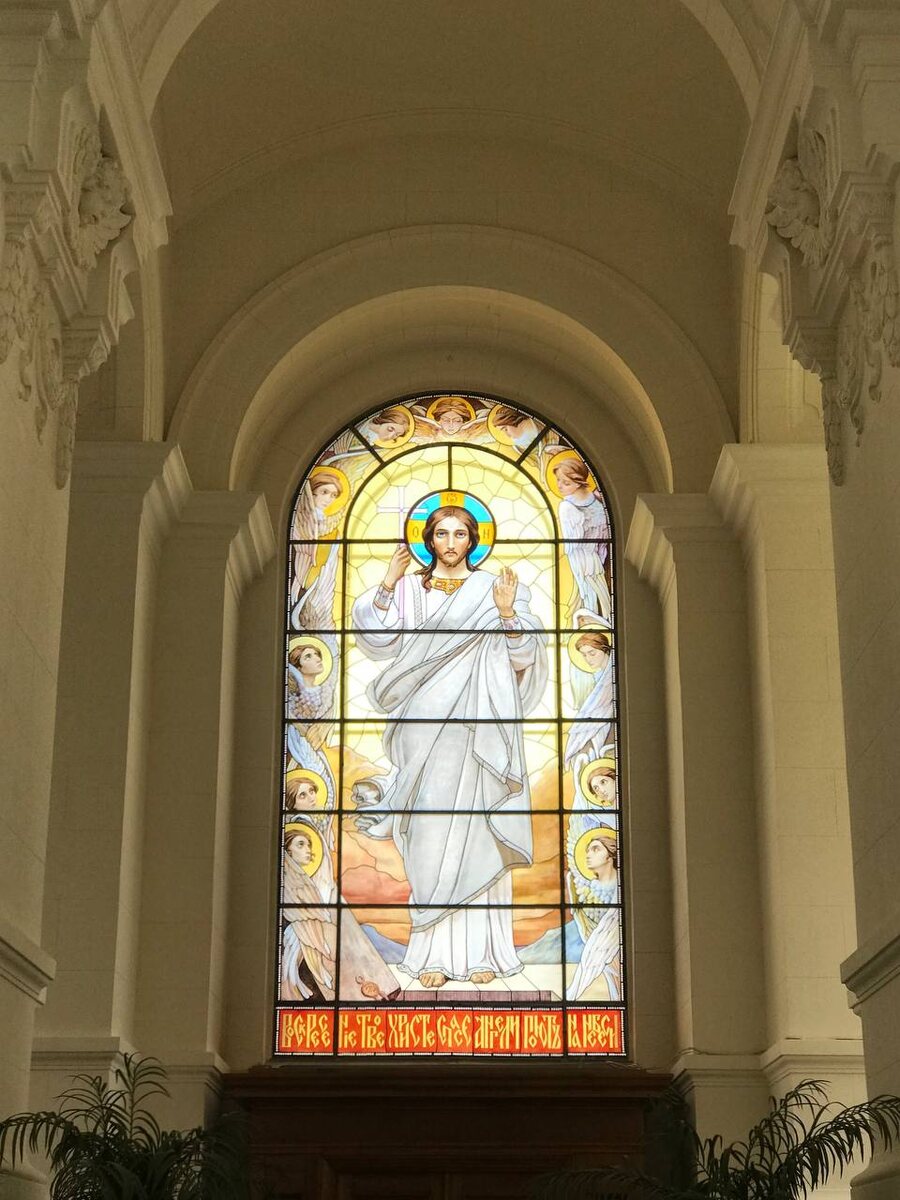 Князь-Владимирский собор — витражный образ Благословляющего Спасителя находится в алтаре Собора, посмотреть фото можно здесь,