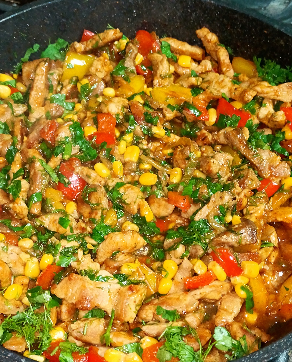 ИНГРЕДИЕНТЫ ПРИГОТОВЛЕНИЕ 1.Мясо нарезаем тонкой соломкой. 2.Мясо обжариваем на раскаленной сковороде до золотистого цвета примерно 5 минут. 3.Лук нарезаем полукольцами. 4.Лук добавляем к мясу и обжариваем 3 минуты. 5.Болгарский перец нарезаем кубиками. 6.Добавляем сладкий перец к мясу и обжариваем примерно 3 минут. 7.Зубчики чеснока натераем на терке и добавляем к мясу также солим,перчим по вкусу и добавляем 1 ч.ложку хмели-сунели .Все перемешиваем. 8.Затем добавляем томатную пасту ,вливаем воду ,все хорошо перемешиваем ,уменьшаем огонь до минимального, накрываем сковороду крышкой и тушим свинину с овощами 30минут. В процессе тушения при необходимости добавить ещё немного воды. 9.По истечении врмени добавляем кукурузу к мясу и тушим еще 3 минуты. 10. Мелко нарезаем петрушку и укроп, посыпаем готовое блюдо зеленью . Блюдо готово можно подавать к столу с любым гарниром.