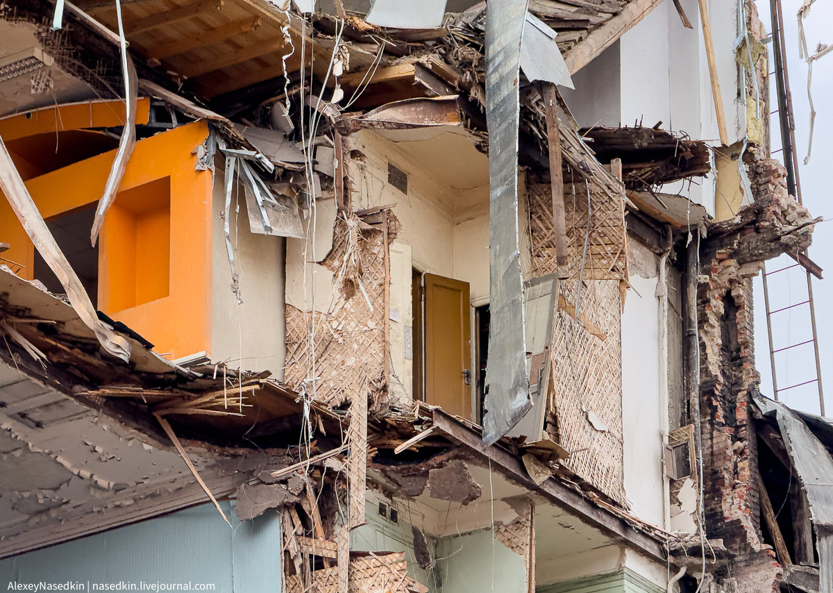Когда-то здесь теплилась жизнь со её радостями и невзгодами, но теперь внезапно всё оборвалось. Даже пресловутых Томагавков дожидаться не пришлось, преступление было совершено собственными руками. И даже обитатели расположенного буквально через дорогу монастыря взглянули на это будто бы без сожаления. Ах как нахваливают мой родной город в официальных пабликах, на страницах муниципальных газет и в прочих прикормленных СМИ/блогах. Разве не лепота на фото? А пройдёшь пару шагов вперёд и челюсть отвиснет. Не у всех, правда, лишь у особо чувствительных к нескончаемой столичной драме. Но таких мало, увы. Как бы то ни было, минус ещё один ценный объект уничтожен группой лиц по предварительному сговору - иностранными специалистами под крылом эффективных менеджеров из Когалыма. Это дом-коммуна "Изотерма", построенный в 1929–1930 годах. Выдающийся памятник конструктивизма авторства архитектора Николая Колли. Долгое время он никому не мешал, но алчность вкупе с холодным цинизмом взяли своё. Моско