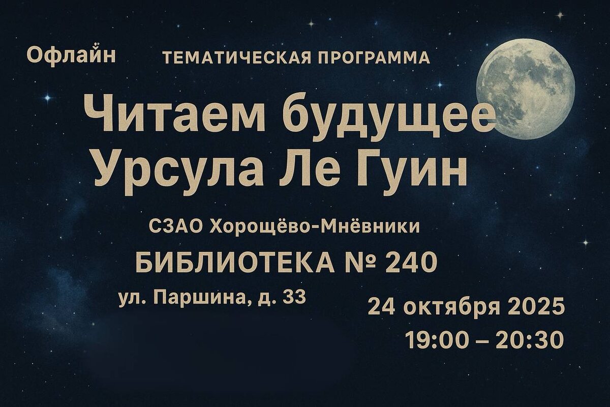 📚 Читаем будущее: Урсула Ле Гуин ✨ Тематическая программа в библиотеке № 240 📅 24 октября 2025 года 🕖 19:00 – 20:30 📍 Библиотека № 240, ул. Паршина, д. 33 (район Хорошёво-Мнёвники, СЗАО) Приглашаем всех поклонников фантастики на встречу, посвящённую великой писательнице Урсуле Ле Гуин! 🔹 В программе: – Лекция «Читаем будущее: Урсула Ле Гуин» – Тематическая дискуссия «Моя Урсула» – Квиз «Путешествие в Земноморье» – Презентация выставки «Это фантастика» 🎟 Вход свободный, требуется регистрация → tickets.mos.ru 📞 +7 (499) 720-19-85 👥 16+ #Москва #СЗАО #Библиотека240 #ХорошевоМневники #ОКЦСЗАО #Библиотека #ЧитаемБудущее #УрсулаЛеГуин #Фантастика #Земноморье #Квиз #КультураМосквы #Книги #Литература #МероприятияМосква #ЭтоФантастика