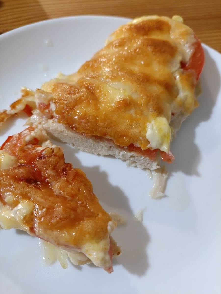 Запеченное филе курочки под сырной корочкой. (Филе, сверху лук, помидор, сеточка из майонеза,сверху сыр, запекать в духовке 15 минут.)