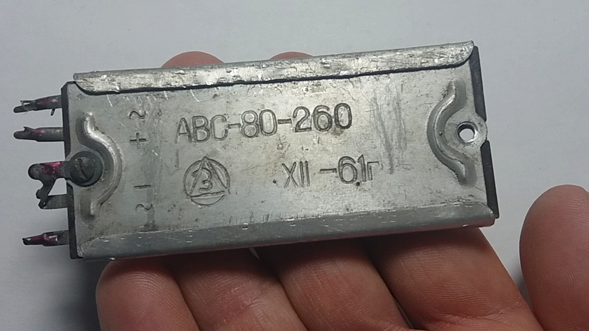 Вот мой экземпляр 1961 года, без малого 64 года! Краткое описание: АВС-80-260 — это селеновый выпрямитель, устаревшая радиодеталь, которая использовалась для преобразования переменного тока в постоянный. Внутри устройства находятся: селеновые пластины соединённые последовательно. Конструкция представляет собой столбик таких пластин. Выпрямитель рассчитан на выходной ток до 80 мА при напряжении 260 вольт. Принцип работы: Каждая отдельная пластина выдерживает небольшое напряжение (20–30 В), а их последовательное соединение позволяет получить необходимую выходную мощность.