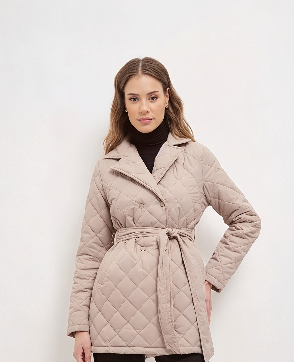 Обратите внимание на варианты с ромбовидной стёжкой средней величины — она создаёт элегантную фактуру, не добавляя лишнего объёма. Приталенные модели с поясом особенно хороши: они подчёркивают силуэт и создают женственную линию. Длина до середины бёдер или чуть ниже — оптимальна, такая куртка прикрывает бёдра и при этом не укорачивает ноги визуально.