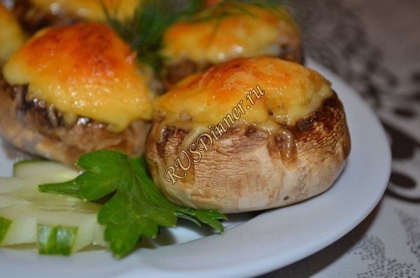 Шампиньоны, фаршированные фаршем От автора: Шампиньоны, фаршированные фаршем совмещают в себе красоту и отличные вкусовые качества, рекомендую. Ингредиенты: Грибы шампиньоны - 500 гр. (крупные) Свинина - 400 гр. Лук репчатый - 1 шт. Сыр - 100 гр. Соль - 5 гр. Перец черный молотый - 5 гр. Масло сливочное - 50 гр. (для жарки) Источник: https://rusdinner.ru/page/shampinony-farshirovannye-farshem