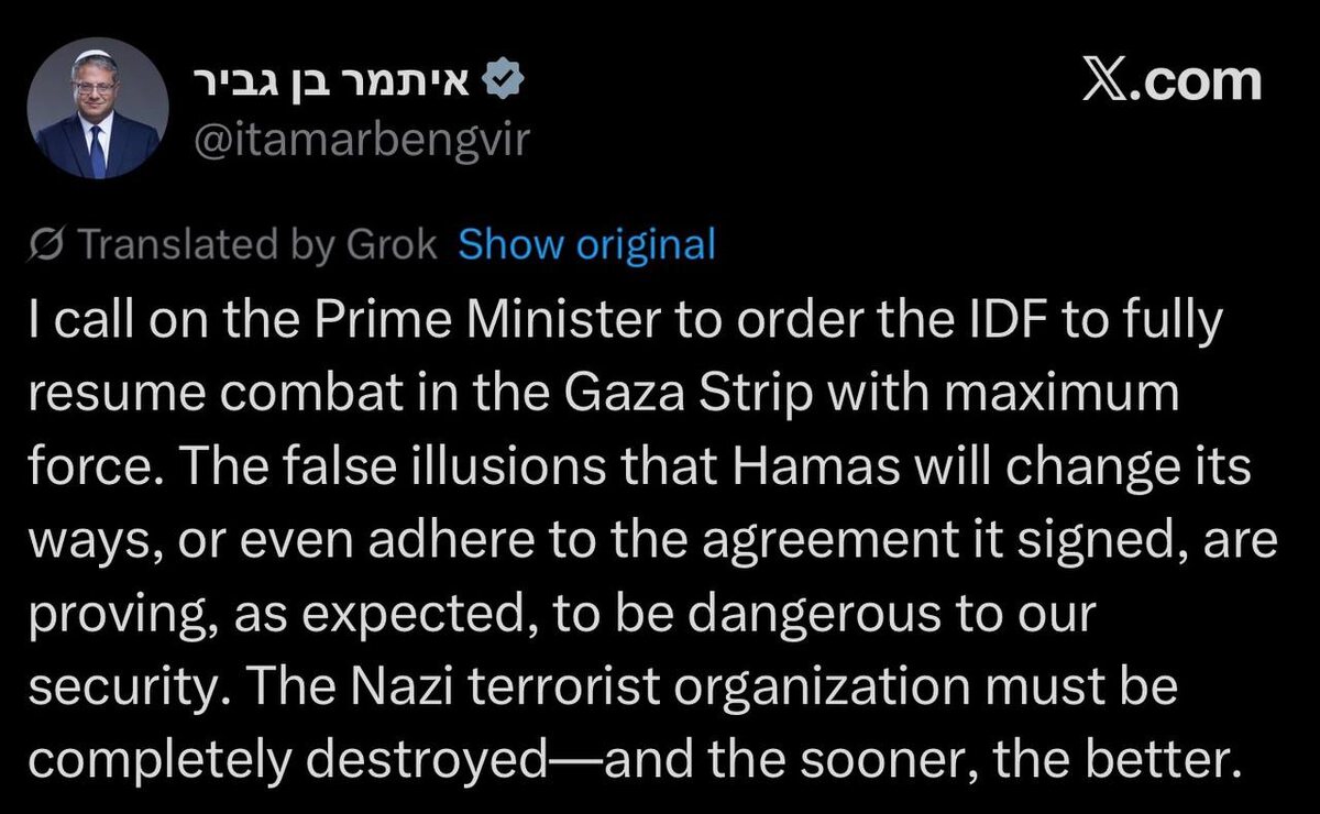 В ответ на пост Israeli National Security Minister Ben-Gvir calls on Netanyahu to resume military operations in Gaza amid reports of ceasefire violations 'The Nazi terrorist organization must be completely destroyed — and the sooner, the better'