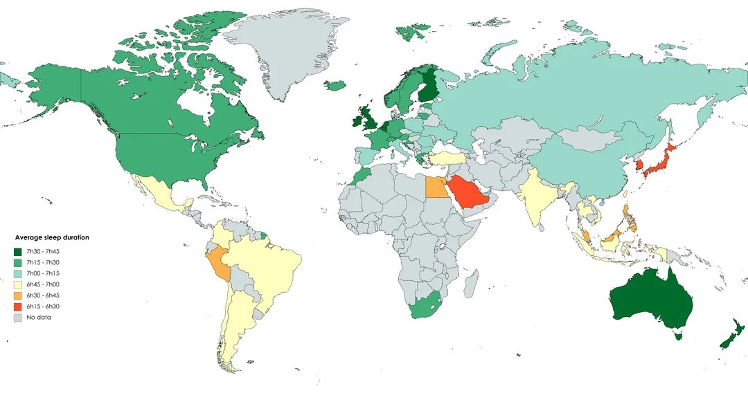 Есть два типа людей: те, кто просыпается с первыми лучами солнца, и те, чей мозг включается только после десяти. У нас принято разделять таких людей на «жаворонков» и «сов». Но что, если целые страны можно разделить по тому же принципу? Глобальная дисперсия сна: от голландских мечтателей до японских трудоголиков Рекордсменами по продолжительности сна являются Нидерланды и Новая Зеландия. Эти страны стабильно занимают первые строчки в мировых рейтингах, показывая в среднем больше 8 часов сна в сутки. За ними следуют Франция, Финляндия и Австралия. На другом полюсе — Япония и Южная Корея, где средняя продолжительность сна часто не дотягивает даже до 7 часов. Сингапур и Объединенные Арабские Эмираты делят с ними печальную славу самых невысыпающихся наций. Здесь сон — не роскошь, а ресурс, который безжалостно расходуется в пользу работы и социальной жизни. А где же мы? Россия занимает усредненную позицию на этой карте. Мы — нация полуночников. Средний россиянин ложится спать в 1:05 ночи, п