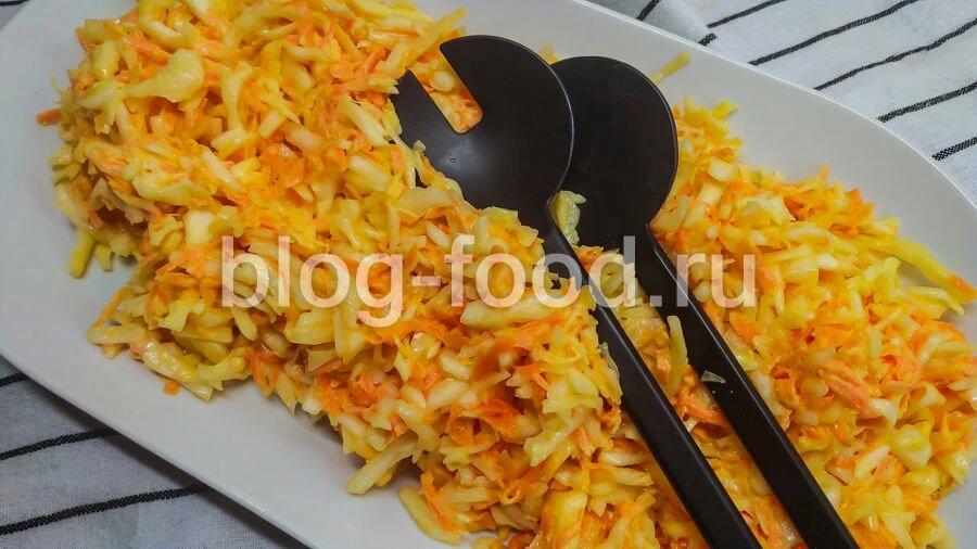 Всем привет. Съездили на дачу, закрыли сезон, дособирали урожай и привезли в город несколько кочанов капусты, охапку моркови, яблоки и т. д. Решили употребить всё по назначению, приготовив обычный для нашей семейки салат и оказалось, что на страницах этого блога я его ни разу не описывал. Исправляюсь ) Коул Слоу (или правильнее «Коулсло») как любое «народное» блюдо имеет кучу вариаций. Где-то кладут кукурузу, кто-то добавляет лук. В одном месте к белокочанной капусте добавят красную, в другом даже положат квашеную. Мы обычно делаем с яблоком, но в этот раз решили пустить их на замечательный невидимый пирог, а в салате обойтись только капустой, морковью и соусом — куда ж без него ). Продуктовый набор: Капусту режем соломкой, морковь натираем на средней тёрке. В капусту высыпаем соль, сахар, выжимаем лимонный сок, сильно мнём руками, оставляем на пять минут. Добавляем морковь, перемешиваем. Соединяем сметану, майонез и горчицу. Заправляем, досаливаем по вкусу, перемешиваем и подаём Прия