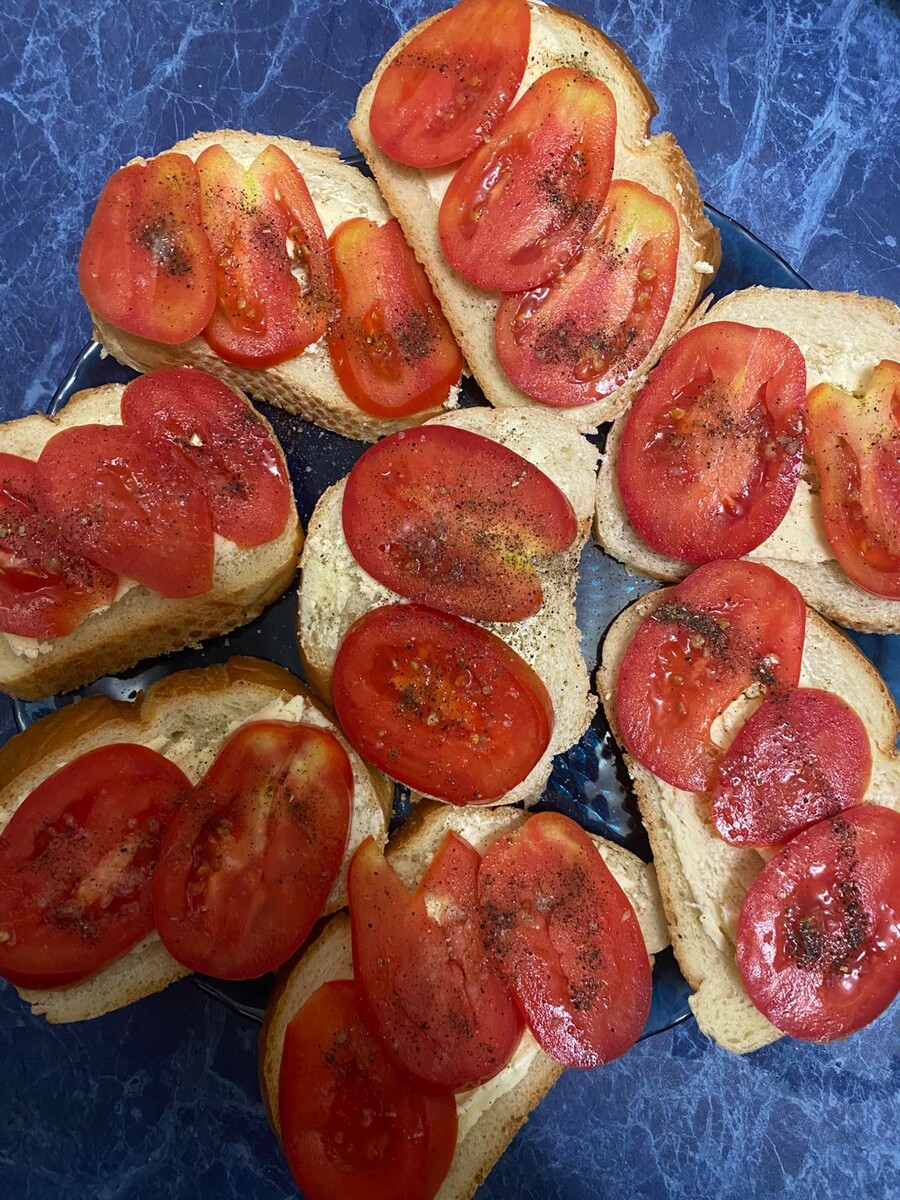 Здравствуйте, мои дорогие! Субботний рецепт плавно перешел в рецепт выходного дня). Начался учебный год, поэтому с трудом успеваю писать и хоть что-то делать по дому (хорошо, что у меня все взрослые). Рецепт сегодня будет легкий и быстрый, вернее два рецепта бутербродов, которые мы в семье делаем уже много лет. Очень быстрые и относительно недорогие закуски. Итак, первый. Бутерброды с помидорами. Рецепт от моей свекрови, которой, к сожалению, уже нет с нами. Замечательная женщина и отличная хозяйка! Кстати, готовить моя доченька училась именно у бабушки. Нам понадобится батон, сливочное масло, помидоры, лук, соль и молотый перец. Все быстро и просто. Режем батон, намазываем сливочным маслом. Я сливочное масло практически не ем, поэтому лично для себя намазываю его совсем-совсем мало, слегка для вкуса. Так что здесь на любителя. Моем и нарезаем кольцами помидоры. Я предпочитаю для бутербродов брать крупные и мясистые, но в этот раз у меня «сливки», тоже очень вкусно получилось. Помидоры