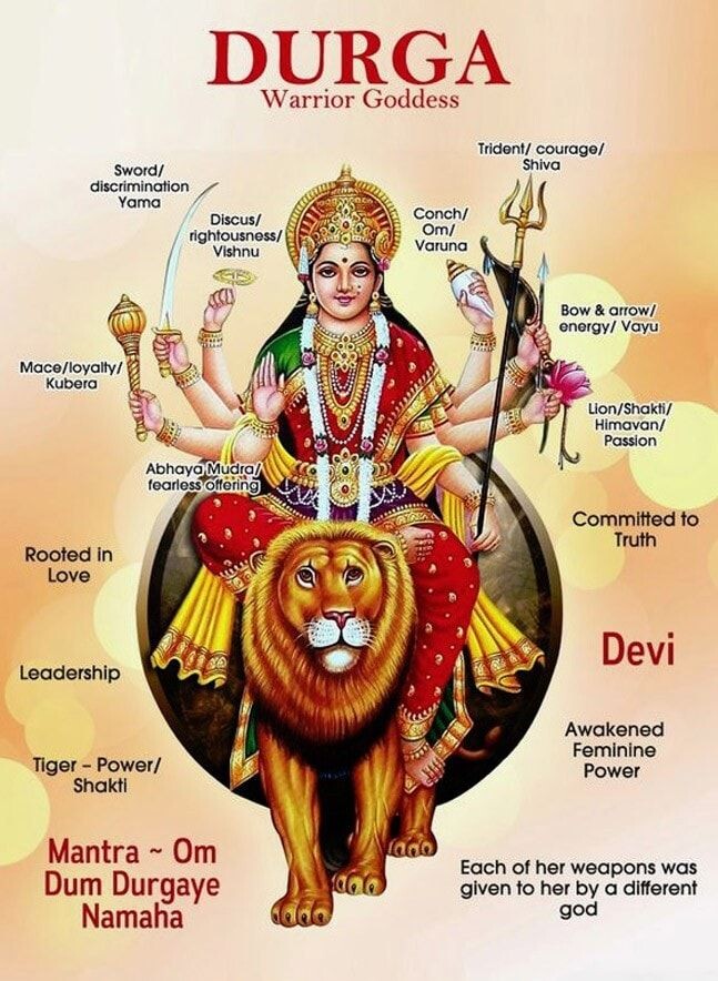 Кто такая Дурга Богиня Дурга в индуизме имеет значение, связанное с борьбой со злом, защитой и восстановлением гармонии. Её образ олицетворяет победу добра над злом, света над тьмой и знания над невежеством. Дурга выступает как богиня-воительница, сражающаяся с демонами, защитница богов и мирового порядка. Один из известных подвигов — уничтожение в поединке демона Махиши, низвергнувшего богов с небес на землю. Также Дурга покровительница женщин — призывается ими при родах. Еще ее призывают, чтобы установить равновесие и гармонию, покой и благополучие. Элементы символики Дурги: Десять рук — представляют различные качества, необходимые для преодоления препятствий, включая силу, знание, мудрость и сострадание. Лев или тигр — олицетворяют силу и мужество, агрессию и свирепость. Трезубец — олицетворяет три аспекта существования — созидание, сохранение и разрушение. Три глаза — символизируют Солнце, Луну и Огонь — прошлое, н