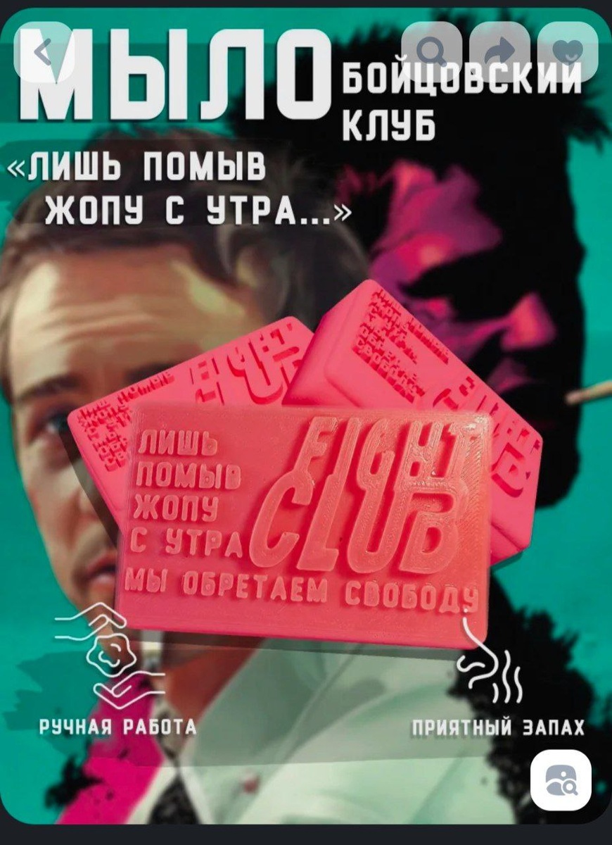 Мыло по «Бойцовскому клубу» продают на маркетплейсах — вдохновляться утром сильной цитатой можно за 202 рубля.