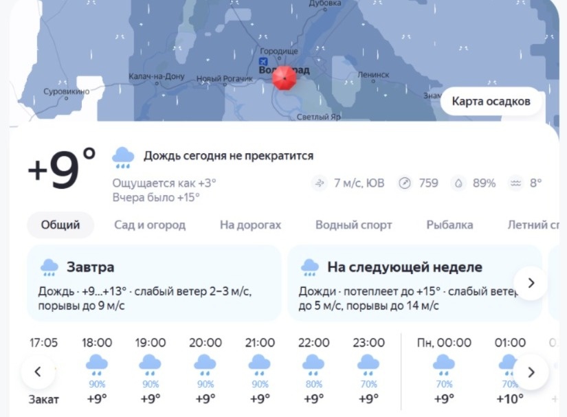 По данным сервиса «Яндекс. Погода», многочасовой дождь сегодня в Волгограде не прекратится. Волгоград и область с утра накрыла огромная дождевая туча, которая на данный момент разрозненно протянулась от Краснодарского края через Ставрополье и накрыла всю Волгоградскую область (даже небольшие районы области). Льет этот же дождь сейчас и в Саратове, и Саратовской области. Туча-гигант медленно, но верно приблизилась к Тамбову, Пензе. В Волгограде дождь с утра продолжается от Октябрьского района области до самой северной части региона – Елань, Жирновск, Новоаннинский район. Естестественно, огромная туча плотно собой накрыла районы Волгограда, и пока уходить никуда не собирается. После 20:00 осадки ослабнут, но не прекратятся. Сервис демонстрирует, что масштабы тучи от Волгограда к 03:00 ночи растянутся до Брянска. Лить к этому моменту продолжит еще выше – в Тамбове и Саранске. И только лишь к завтрашним 09:00-11:00 утра туча медленно неохотно, практически до самого вечера будет сдвигаться