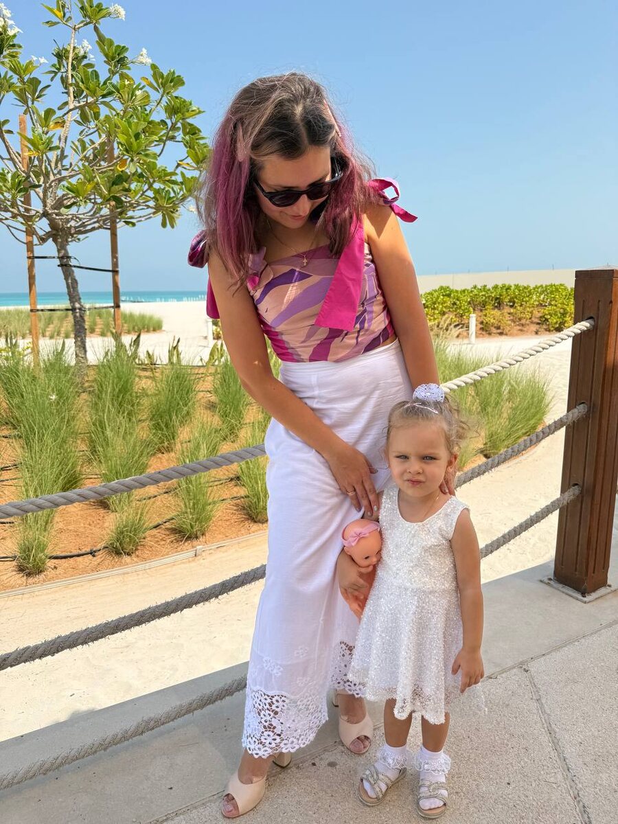 Хочется больше делиться с вами будничным ✨ Рубрика Family Look продолжается на этот раз образом «мама-дочка» 💕 На мне юбка-карандаш из невесомого хлопка с кружевом по низу и топ с завязками-бантами моего дизайна. На Аделине мини-платьице из шикарной итальянской паутинки с бисером и мерцающими пайетками. Эту ткань я шила полностью ручным стежком 🪄