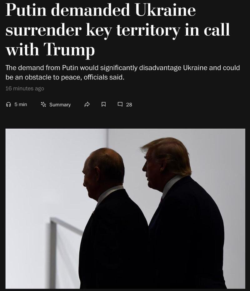Президент России Владимир Путин во время телефонного разговора с Дональдом Трампом потребовал полного освобождения ДНР, сообщает The Washington Post со ссылкой на источники.
