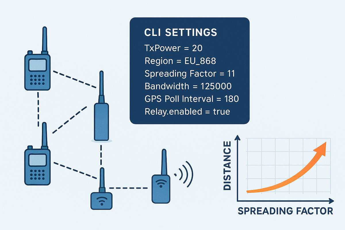 В статье анализируются методы увеличения радиуса действия трекеров в сети Meshtastic с одновременным снижением нагрузки. Представлены аппаратные и программные подходы, основанные на технологии LoRa с использованием CLI. Приводится физико-математическое обоснование ключевых параметров, управляющихся через CLI, с подтверждением их оптимальности на практике. Введение Meshtastic — децентрализованная mesh-сеть с использованием технологии LoRa и Chirp Spread Spectrum (CSS). Работает в нелицензируемом частотном диапазоне ISM, обеспечивает энергоэффективную дальнюю связь для передачи сообщений и GPS-координат в условиях отсутствия традиционных сетей. Задача — увеличить радиус действия устройств без потери качества и с контролем энергопотребления. Почему CLI, а не мобильное приложение? Мобильное приложение предоставляет удобный базовый интерфейс, но не даёт доступа к ключевым параметрам радиосвязи, таким как spread factor, полоса пропускания, мощность передачи и ретрансляция. CLI обеспечи