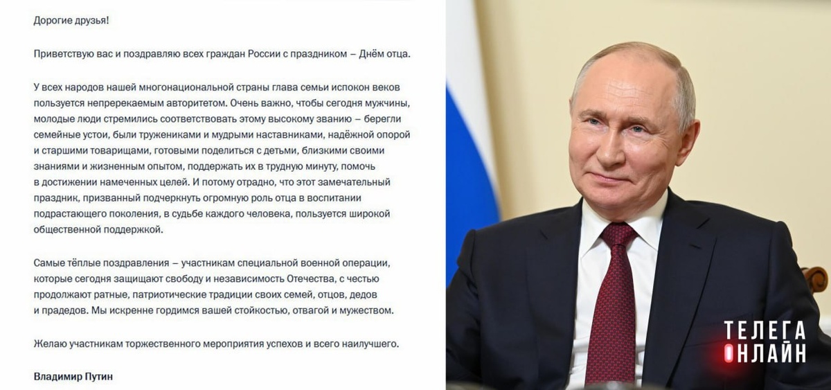 С Днем отца! Президент поздравил российских пап с их днем и пожелал им соответствовать этому высокому званию, беречь семейные устои, быть тружениками и мудрыми наставниками. Присоединяемся! 🚲 Подпишись на Телега Online