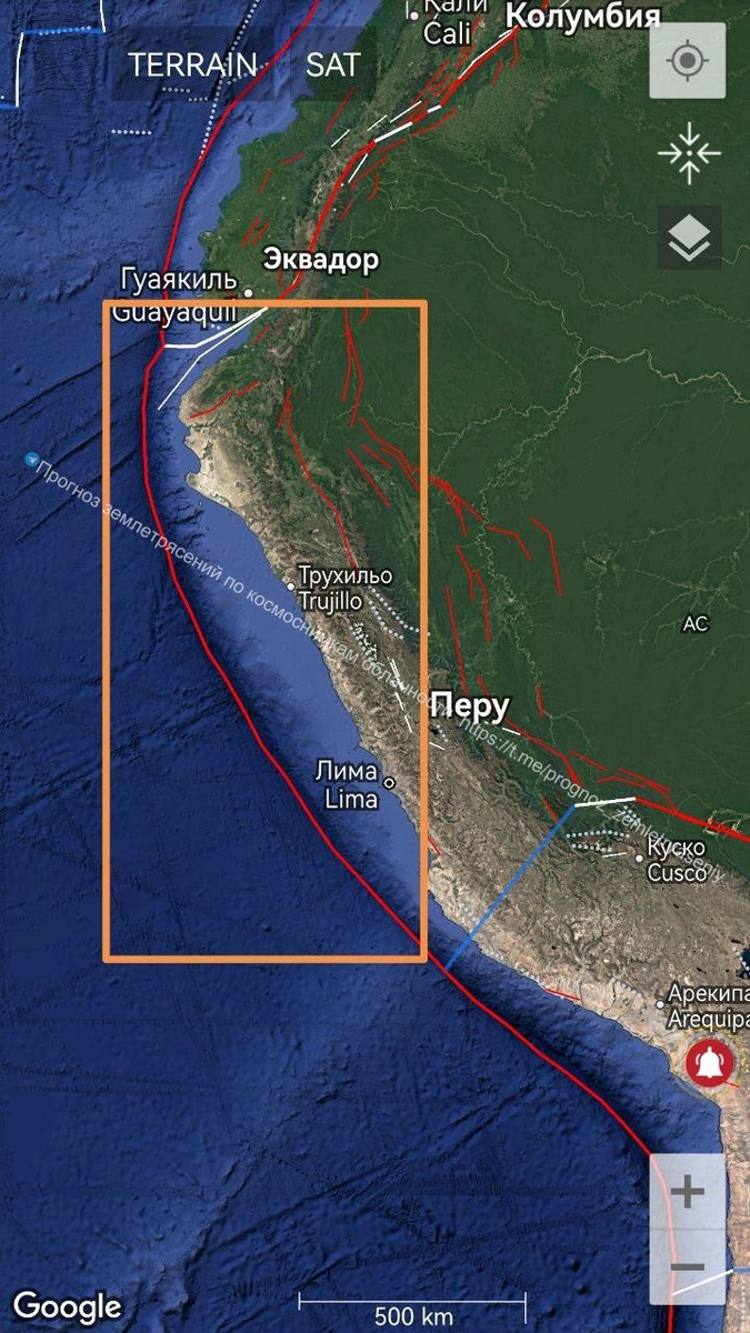 На уровне М6-7 вновь дегазируется зона от Перу до Эквадора по границе плиты Наска. ===== The zone from Peru to Ecuador along the Nazca Plate boundary is being degassed.