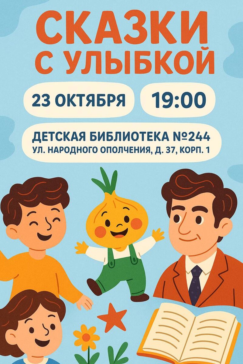 📚 ГБУ г. Москвы «ОКЦ СЗАО» Детская библиотека №244 приглашает на мероприятие ✨ «Сказки с улыбкой» 📖 Офлайн-встреча о жизни и творчестве Джанни Родари! 23 октября с 19:00 до 20:00 в детской библиотеке №244 состоится комплексное мероприятие, посвящённое любимому итальянскому писателю. 👦👧 Дети узнают: — кто такой Джанни Родари и почему он считал, что детство — лучший период жизни; — как фантазия помогает стать счастливым; — а ещё примут участие в викторине, где, отвечая на вопросы, спасут Чиполлино и его друзей из лабиринта 🧅🗝 📚 Продолжением станет интерактивное громкое чтение сборника «Сказки с улыбкой», где каждый сможет проявить себя как чтец. 🎨 Завершит вечер мастер-класс по созданию любимого персонажа из сказок Дж. Родари! 🗓 23 октября 2025 года ⏰ 19:00–20:00 📍 Детская библиотека №244, ул. Народного ополчения, д. 37, корп. 1 (район Щукино, СЗАО) 🎟 Вход свободный, регистрация по ссылке: mos.ru/afisha/event/354078257 📞 +7 (499) 194-05-23 👶 6+ #библиотека244 #ОКЦСЗАО