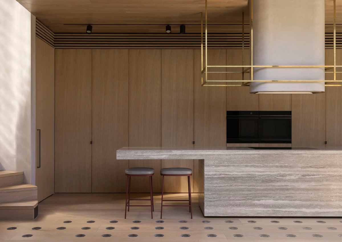 Фасад восстановлен: свежая расшивка швов и мозаичная плитка. Внутри сохранены прессованные потолки и молдинги, добавлены дубовые полы и венецианская штукатурка. Свет заливает пространство через стеклоблоки и витражные панели, отражающиеся в бассейне. Кухня в галерейном стиле — сердце дома: облицована деревом, с монолитным островом из травертина и скрытыми приборами. Она функциональна, но скульптурна, с видом на бассейн и игровую комнату.