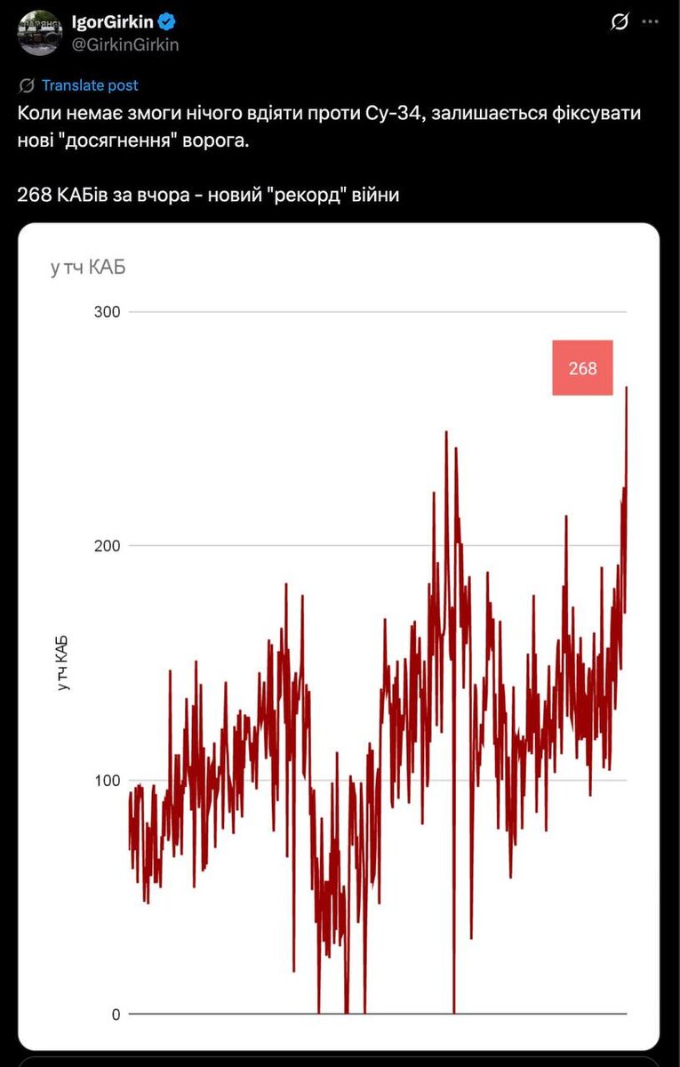 Вчера зафиксировано рекордное количество ударов ФАБами со стороны ВС РФ. Было скинуто не менее чем 268 авиабомб. Это привет тем дурачкам, которые верят, что Россия выдохлась и согласиться с условиями Киева по окончанию войны. Ситуация противоположная, российская армия лишь наращивает боевые возможности, а значит никто щадить киевский режим не будет!