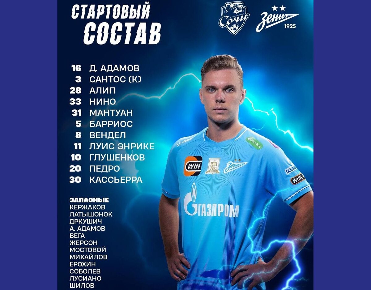 В стартовый состав «Зенита» вошли Адамов, Сантос, Алип, Нино, Барриос, Вендел, Энрике, Мантуан, Глушенков, Педро, Кассьерра. В состав «Сочи» – Дюпин, Солдатенков, Аттият-аллах, Марсело, Волков, Сааведра, Зиньковский, Мухин, Ежов, Игнатов, Камано.