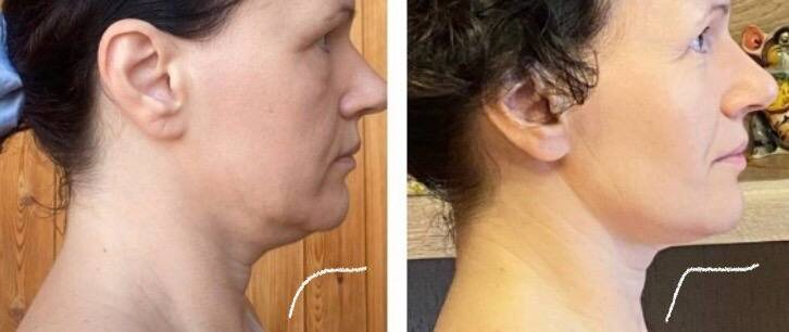 На фото в профиль хорошо видно как вытянулась шея, поднялась зона под подбородком. Проявился челюстной угол, контур нижней челюсти стал четким.
