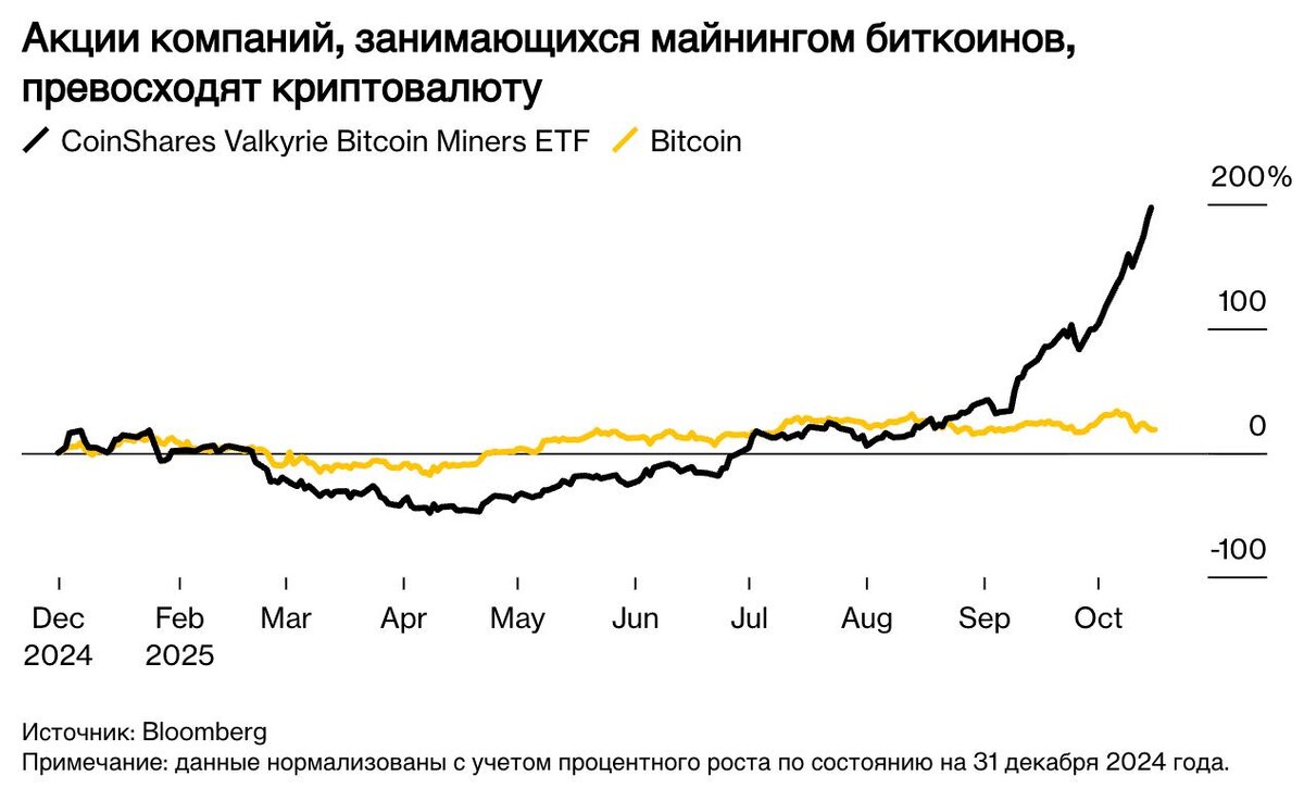 ИИ вытесняет майнинг с мощностей ЦОДов По данным Блумберг, фонд, отслеживающий акции зарегистрированных майнинговых компаний, вырос более чем на 150% с начала года. В отличие от прошлых циклов, когда акции майнеров росли на фоне роста биткоина, теперь эти компании рассматриваются как: технологическиме инфраструктурные компании. Акции компаний, зарегистрированных на Nasdaq, в этом году выросли примерно на 300% и 500% соответственно, поскольку они переориентировались с чистого майнинга крипты на инфраструктуру ИИ. При этом доходность майнинга находится на минимальном уровне. Даже недавние рекордные максимумы биткоина не принесли существенного облегчения экономике майнеров.