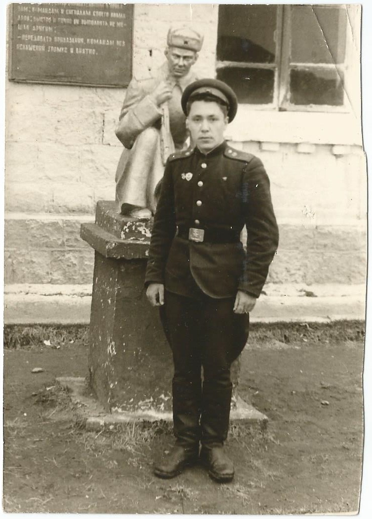 Фотография матроса, проходившего службу в одной из воинских частей Военно-Морского флота, для которой была установлена армейская форма одежды (к ним относились, к примеру, части береговой обороны, караульные и тыловые части и т.д.). В то же время поясной ремень снабжен флотской пряжкой. Солдат одет в парадно-выходную форму одежды образца 1956 года. На мундире расположены знак ГТО образца 1961 года, знак отличника (вероятно, «Отличник ВМФ») образца 1957 года и членский знак ВЛКСМ образца 1958 года. На заднем плане расположена скульптура солдата с винтовкой. Если кто-то из читателей узнал место, где сделан снимок – напишите об этом в комментариях. Подписи на обратной стороне снимка нет. Фото из коллекции автора. Если вы хотите поделиться своими фотографиями 1930-2000 годов – присылайте их на почту istorikmoskalev@mail.ru, и они будут опубликованы на канале.