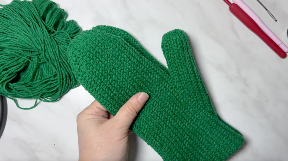 Как сделать бесшовное соединение. Для этого располагаем варежку контрастной нитью к себе. Захватываем столбик между столбиками контрастной нити, затем вводим иглу в полупетлю на противоположном крае изделия, затем в петлю, получившуюся от первого столбика. Затем снова подхватываем столбик между контрастными столбиками, затем в получившиеся петли сверху, затем в полупетлю с противоположной стороны и в петлю, образовавшуюся от столбика. Подробнее смотрите на фото в галерее ниже (картинки можно листать).