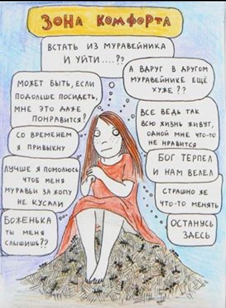 Прикольная иллюстрация! Скорее это не про зону комфорта, а про привычку... Фишка зоны комфорта - в ней комфортно!!! Когда нам плохо, а уходить страшно - это не про комфорт, а про паттерны поведения/ привычки/ реальные возможности ухода... Ну и все в этом роде) Что думаете про картинку? Находили себя в подобных ситуациях? Татьяна Чистякова | Неформальный психолог