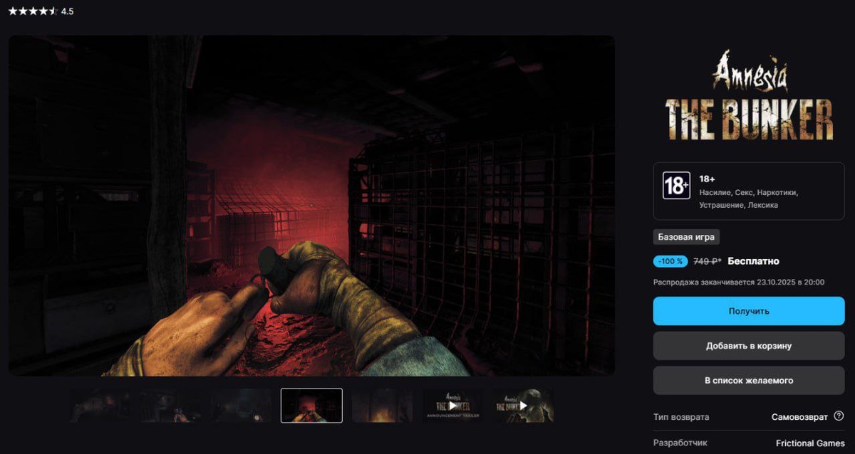 Привет, друзья! В мире видеоигр Epic Games Store снова радует своих пользователей — на этот раз бесплатной раздачей хоррор-игры Amnesia: The Bunker. Это уникальная возможность погрузиться в атмосферу ужаса и напряжения, которая понравится любителям жанра. Игра доступна для российских аккаунтов, но поторопитесь — предложение действует до 23 октября. Amnesia: The Bunker — это не просто очередная игра, это настоящий вызов для ваших нервов. Разработчики смогли создать атмосферу, где каждый шорох и тень кажутся угрозой. Игра демонстрирует, как далеко может зайти индустрия в создании погружающего и напряжённого опыта. Такие акции от Epic Games Store не только привлекают внимание к платформе, но и способствуют популяризации инди-игр, которые могут остаться незамеченными в море больших релизов. Это хороший пример того, как платформы могут поддерживать разработчиков и предоставлять пользователям возможность попробовать разнообразные игры. Что вы думаете по этому поводу? Пишите в комментариях! П