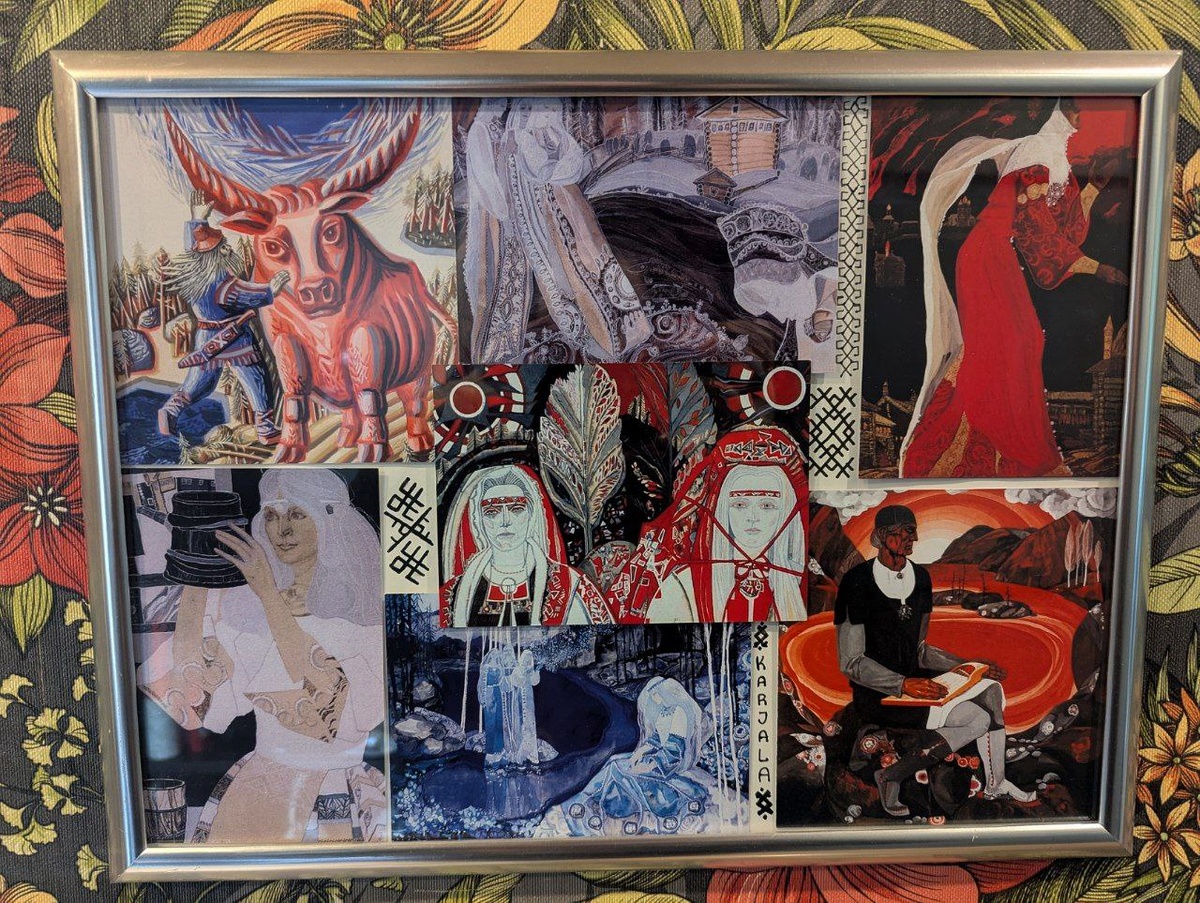 🍁А это открытки по картинам местной художницы 20 века. Вдохновлённые сюжетами "Ка́левала" (карело-финский поэтический эпос, состоящий из 50 рун). Я составила их в такую "картину-воспоминание" с народными узорами Карелии.