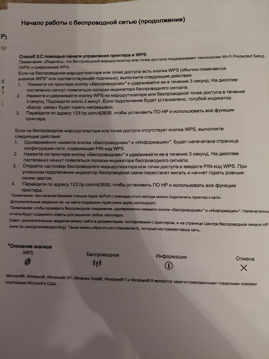Всех приветствую. Столкнулась с такой проблемой, что когда дома поменялся роутер (точка сети)/вайфай, то компьютер не может напечатать документ, потому что компьютер подключен к новой сети, а принтер к старой (несуществующей) Так как отключить его от старой и подключить к новой? 1) Если на принтере нажмете значок "i", то он распечатает инструкцию на 2-х листах "Руководство по работе с беспр. сетью" 2) переходите по ссылке 123.hp.com/dj3630 После знака "/" модель принтера, у вас мб другая и более универсальный вариант писать 123.hp.com - перенаправляет в Google play и скачиваете приложение hp smart 3) принимаем куки 4) добавить устройство 5) настройки нового принтера 6)wi-fi- продолжить 7) даём разрешения - принтера нет в списке 8) обратиться за помощью - далее выбираем модель нашего принтера (поищите гденибудь сбоку на самом принтере) 9) нажимайте "как это сделать?" Нужно, чтобы принтер был в режиме настройки, т.е. в поиске телефона: Зажать значок вайфай и отмены "Х", пока не з
