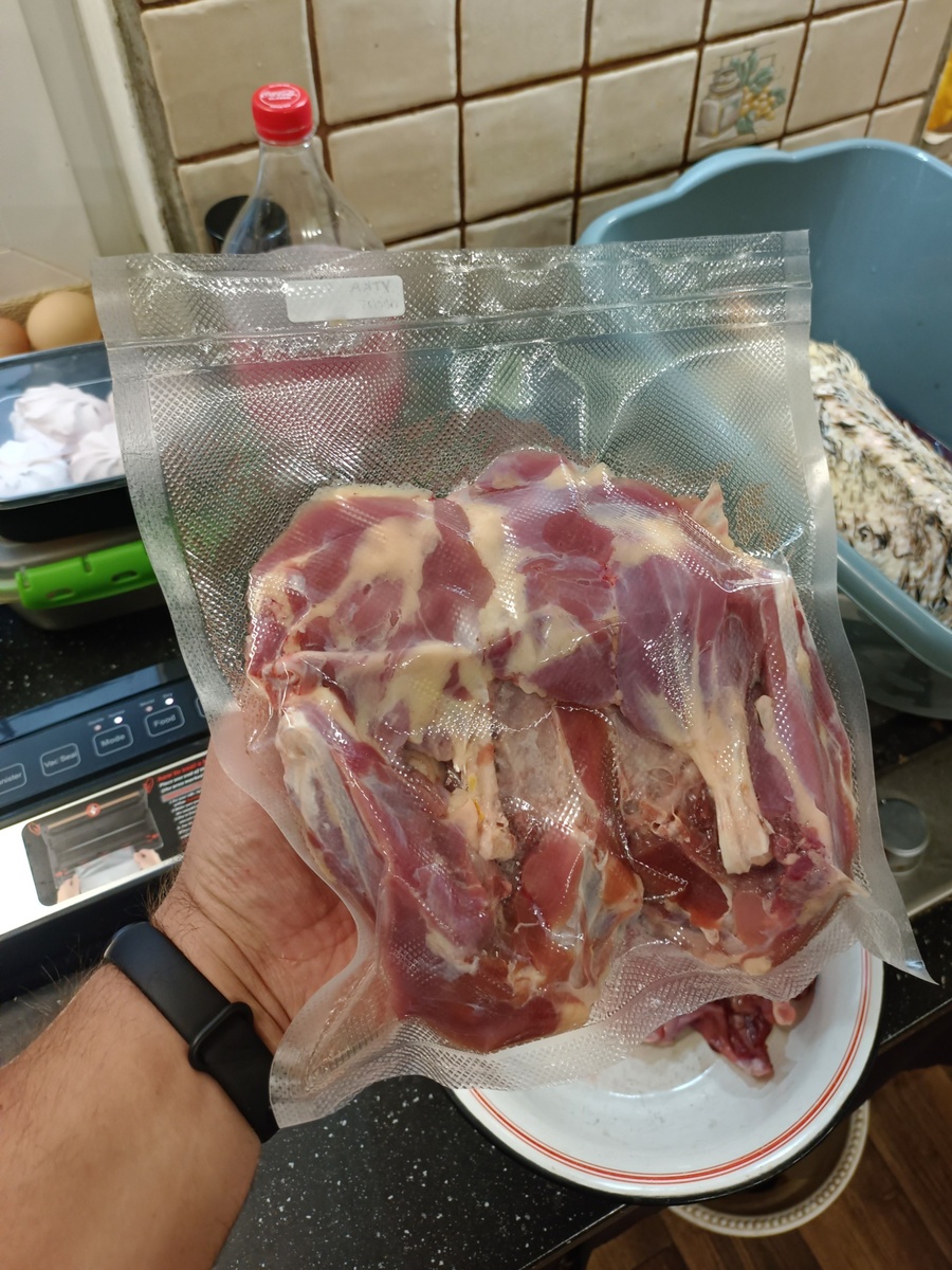 Заморачивайся сейчас — после будет легче! Под таким девизом день проходит. Утка. Снимаю кожу, делю на части, вакуумирую и в шоковую заморозку. Первая — возрастом 4 месяца. По весу финально вышло 900гр. Потрохов тут нет, рёбер суповых нет. Только 2 ножки, 2 крыла да грудка. Приступаю ко второй.