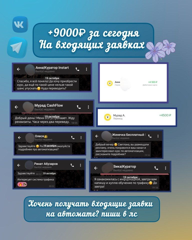 Всем хорошего воскресного вечера🫶 Не смотря, на выходной работа кипит сегодня как никогда...😅 Отвечаю на заявки, в промежутке между домашними делами... Сегодня 25 заявок на вакансию( проект Свой в Альфе) И 10 заявок на автоматизацию из них 2 продажи +9000₽ заработано хорошая конверсия я считаю... А вы что думаете? Также хочу ответить на часто задаваемый вопрос: Что лучше, заказать рассылку или купить программы? Вы знаете, что каждый день без продвижения - это упущенные возможности? 🔵🔵🔵🔵🔵🔵🔵🔵-самый эффективный инструмент для продвижения в Телеграм, благодаря которому у вас будет ежедневный поток ВХОДЯЩИХ заявок... Так что же выбрать , спросите вы.... 💋Я всегда рекомендую ничего не ждать, а брать программы и запускать рассылку самому... 💋Преимущества самостоятельной рассылки: - не нужно никому платить деньги за рекламу - реклама 24/7 - можно тестить рекламный пост и чаты, пока вас не устроит полученный результат - дополнительный заработок на перепродаже - нет абонплаты
